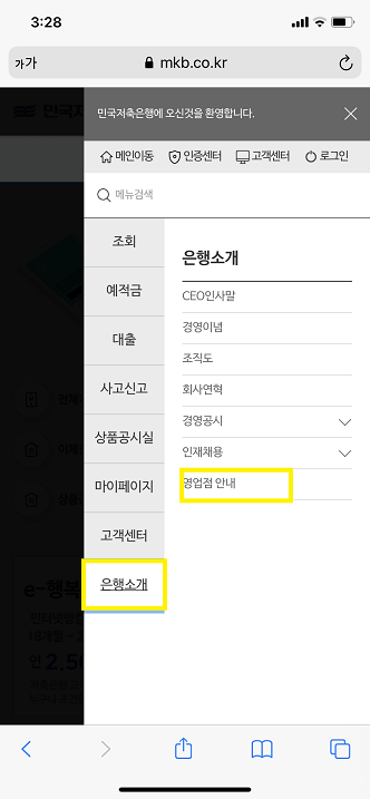 '은행소개', '영업점 안내'를 차례로 클릭해주세요.