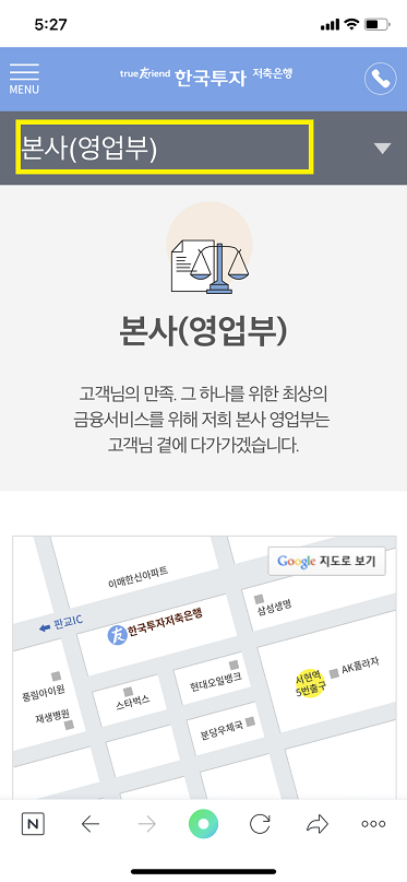 한국투자저축은행을 검색하신 후, '한국투자저축은행 지점안내' 사이트로 접속해주세요.