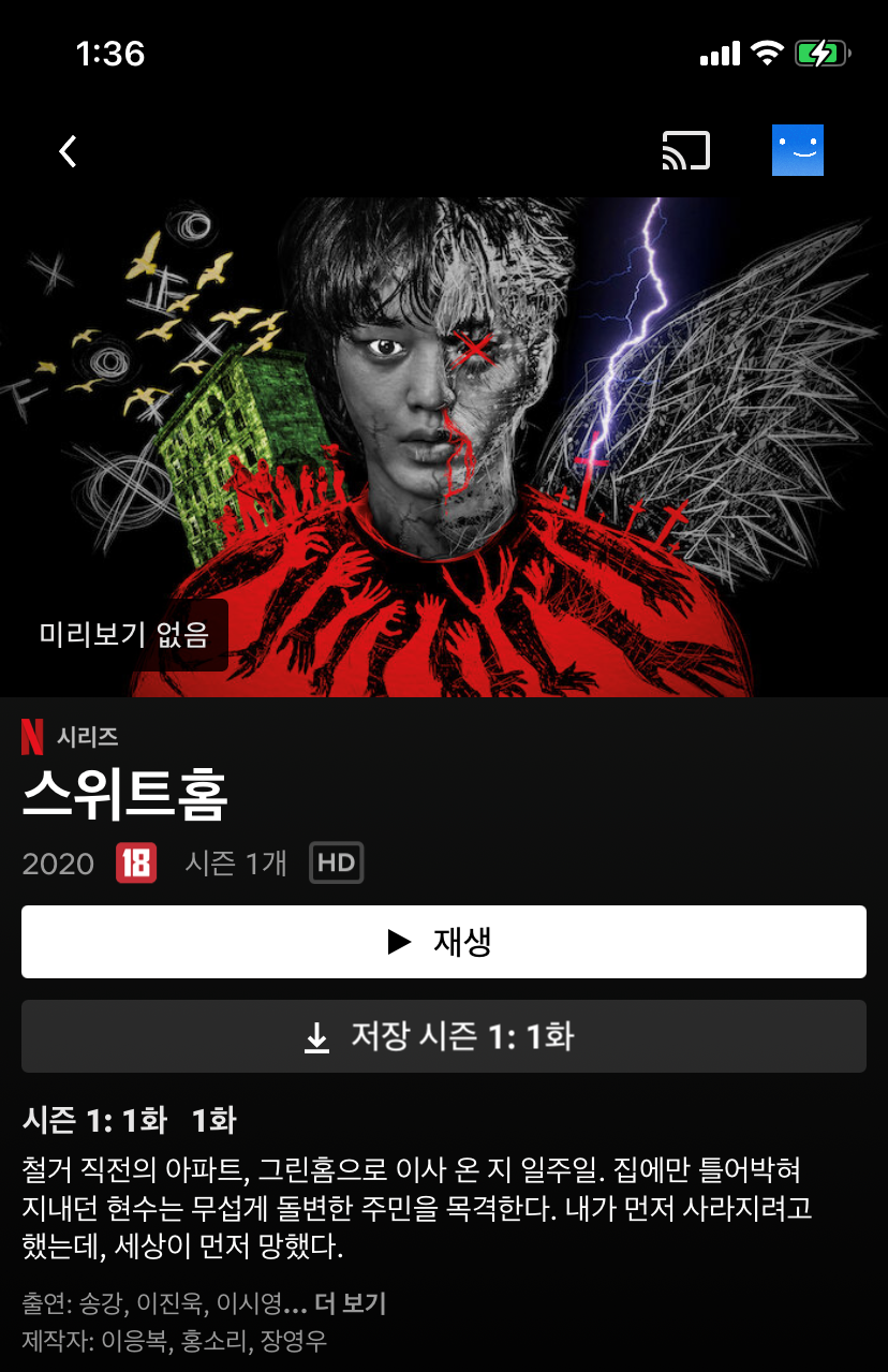 연출 멋있고, 배우들의 연기력이 훌륭해서 모든 캐릭터가 매력적으로 나옵니다. 괴물들이 무서운 장면에서 bgm이 긴장감을 주지 않아 아쉬웠던 점을 빼고는 다 재밌게 봤던 작품입니다. 스위트홈은 유명 웹툰 원작을 바탕으로 만들어진 드라마인데요. 웹툰과는 등장인물, 스토리가 조금 다릅니다. 웹툰의 재밌게 보셨다면 드라마도 웹툰과는 다른 매력이 있으니 시청해보세요.